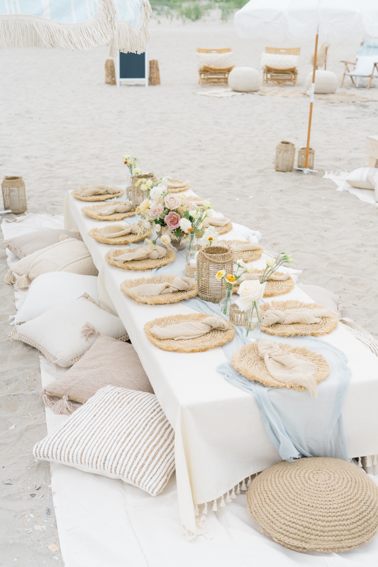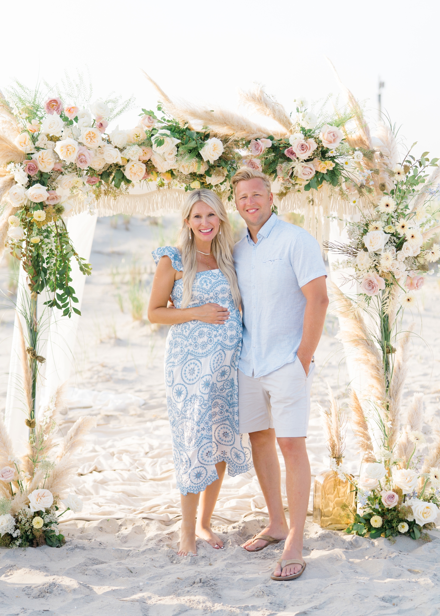 A few weeks ago, we had our dream baby shower! Tim and I love the beach and spend all of our free time in the summers in Ocean City, NJ – so we decided to throw a nontraditional beach party baby shower in our favorite summer spot! The vision was very soft, neutral, calming and bohemian inspired, with a luxe picnic feel. Enter the talented Ali of South Jersey Picnic Co, who helped us execute the vision so beautifully with her amazing luxury pop-up picnics. A special thanks to Ali, as well as Blair of Gilded Lily Events, who ran the day flawlessly. Another special thank you to Erica & Nick of Blushing Fields Flower Farm who created the beautiful floral arch and centerpieces you see – we were obsessed with them! We loved getting to celebrate our little boy with all our loved ones and are so grateful for such a beautiful day. Thank you also to A Cookie for Each Hand for our sweet custom beachy cookies, too! I’ve listed out all our sources at the bottom of the post in case it inspires you to throw your own summer soiree on the beach! We lucked out with the weather, too – it was perfectly cloudy and breezy for the hottest part of the day, and then we got a beautiful sunset as the day ended. We’re so grateful to all of our loved ones who made the trek down to celebrate with us and give us so many beautiful and thoughtful gifts! Now…we just wait on bebe’s arrival!